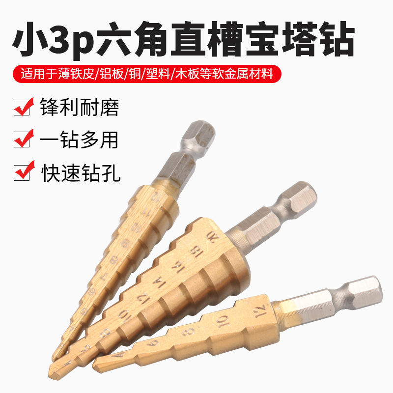 ชุดดอกสว่าน 3 ชิ้น จากโรงงานโดยตรง แบบก้านหกเหลี่ยม ทรงเจดีย์ ชุบไทเทเนียม ฟลูตตรง สำหรับสว่านไฟฟ้า