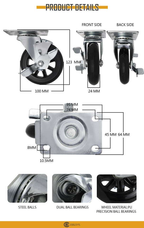 ชื่อผลิตภัณฑ์:ล้อลูกล้อ4นิ้วทำจาก PU เสียงรบกวนต่ำไม่ทำเครื่องหมาย