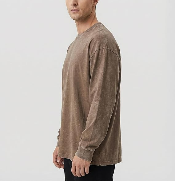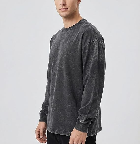 เสื้อยืดโอเวอร์ไซส์แขนยาวสำหรับผู้ชาย สไตล์วินเทจ ล้างสีแบบแอซิด ใส่สบาย สีพื้นหลากสี รับผลิตจากโรงงานโดยตรง พร้อมสกรีนโลโก้ตามสั่ง