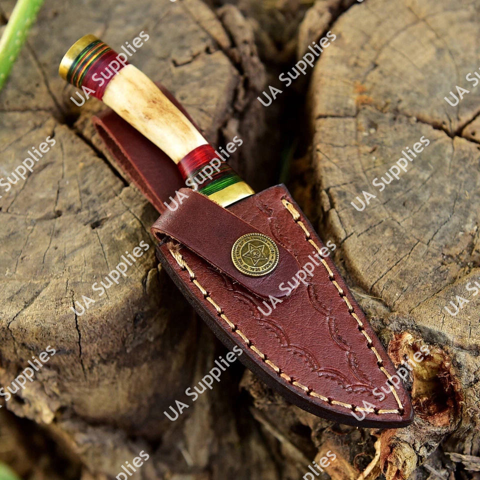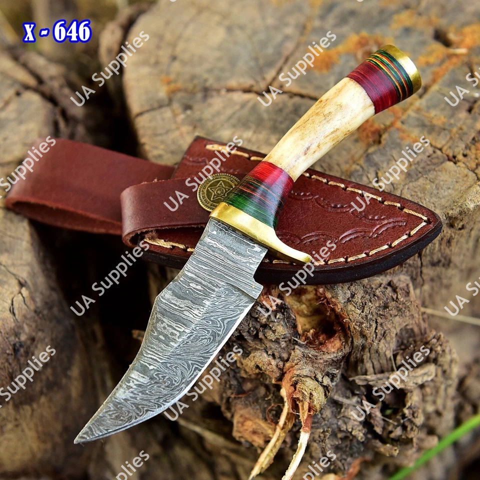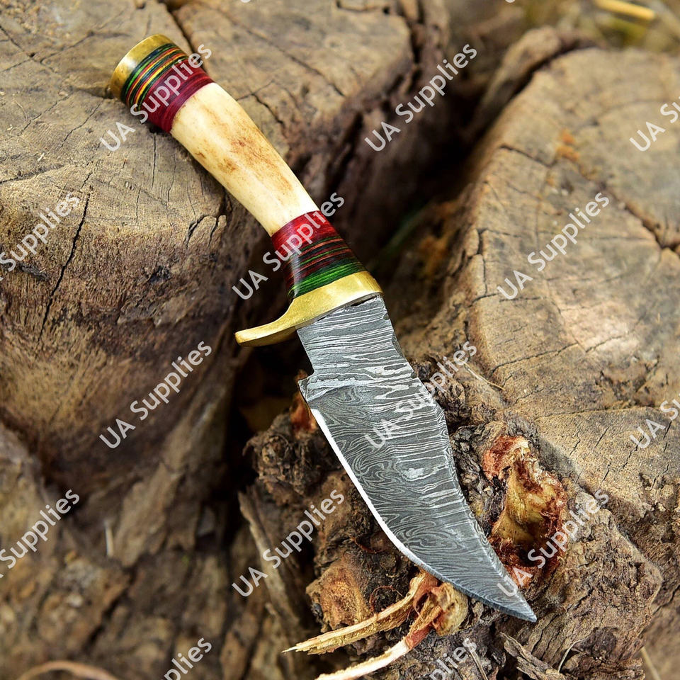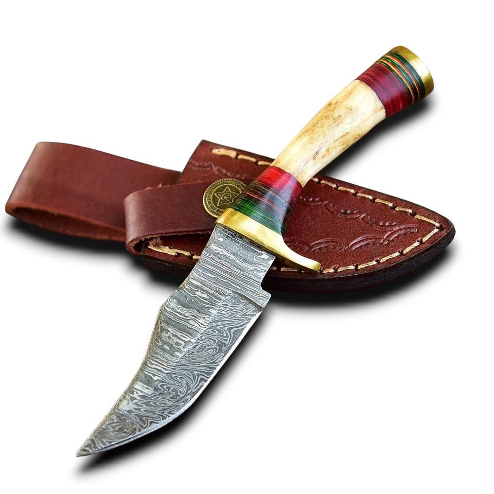 มีดสกินเนอร์ดามัสกัสจากโรงงานผู้ผลิตโดยตรง (OEM) ด้ามทำจากเขากวางแท้ พร้อมปลอกทองเหลืองและปลอกหนัง อุปกรณ์ EDC สำหรับการล่าสัตว์และการเอาชีวิตรอด