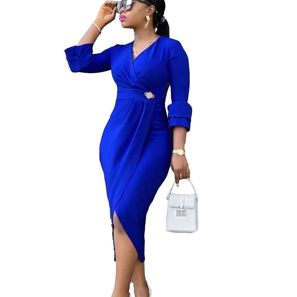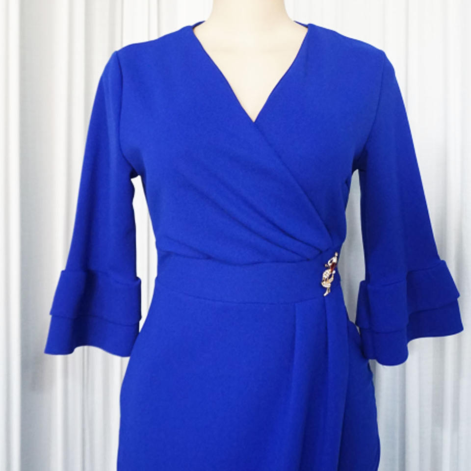 ชุดเดรสทำงานสำหรับผู้หญิงออฟฟิศ,ชุดกระโปรงจีบคอวีเอวสูงสีฟ้า