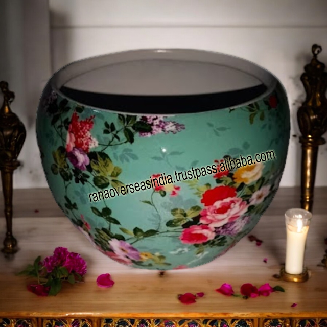 กระถางต้นไม้โลหะทรงกลมดีไซน์ลายดอกไม้เคลือบบนโต๊ะ