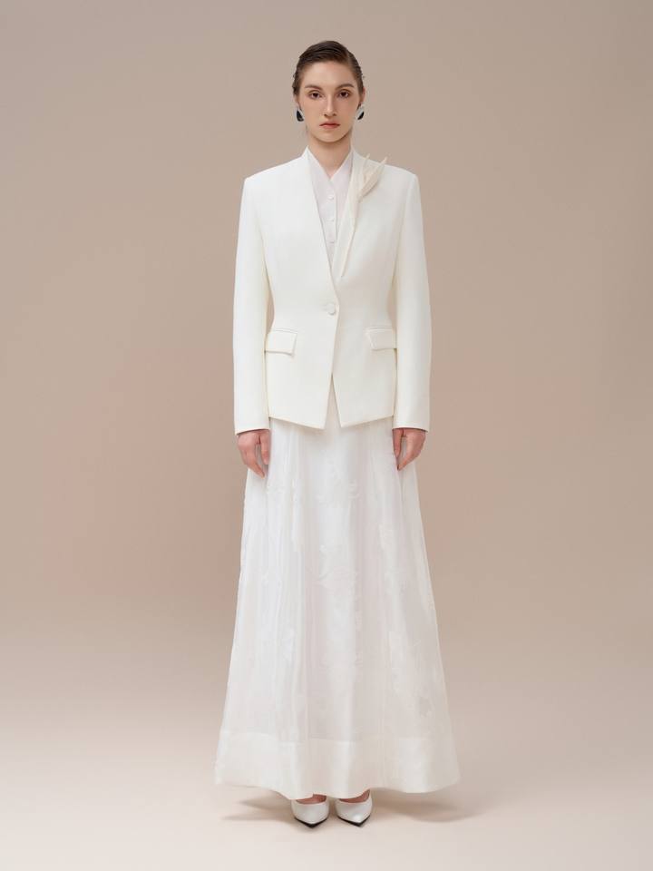 ชุดสูทเบลเซอร์แบบไม่มีปกกระดุมแถวเดียวสำหรับผู้หญิงเสื้อเบลเซอร์แบบสีเฮเซลสำหรับผู้หญิง