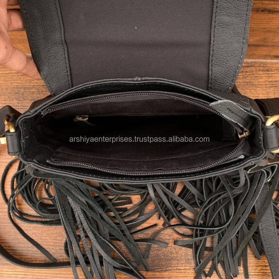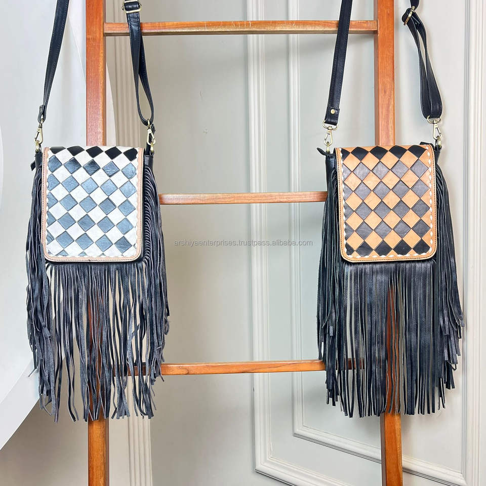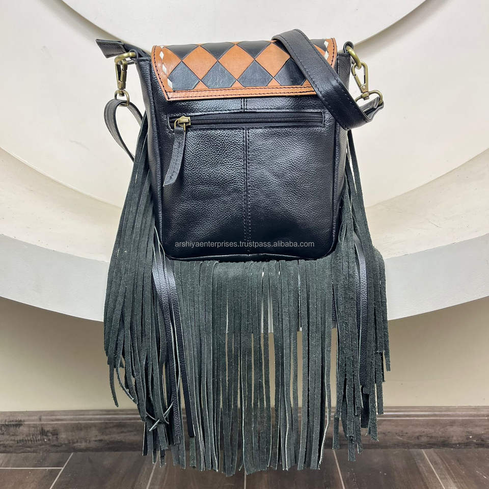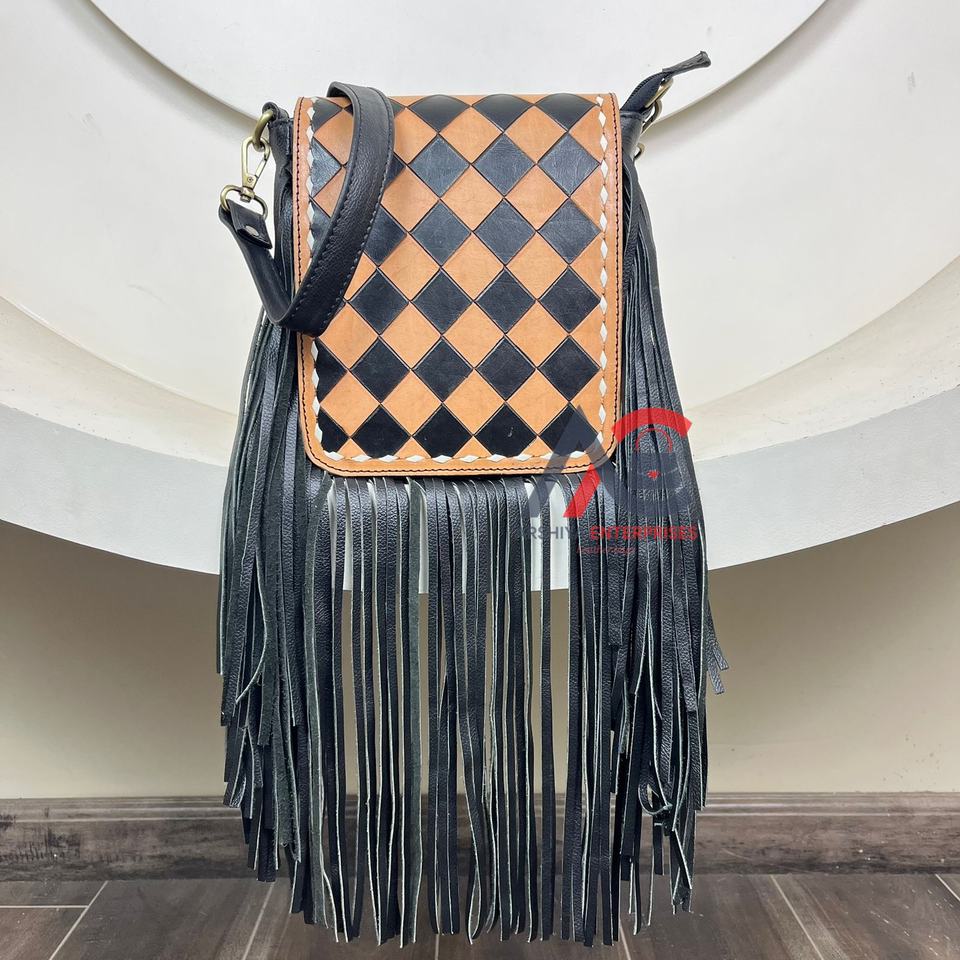 กระเป๋าสะพายข้างหนังวัวสำหรับผู้หญิงสีน้ำตาลและสีดำ
