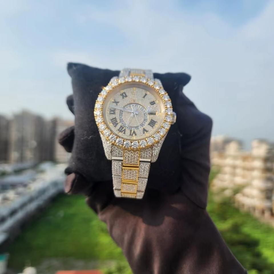 นาฬิกาข้อมือผู้ชายหรูหราประดับเพชรโมอิสซาไนต์ VVS1 แท้จากโรงงาน ตัวเรือนสแตนเลสสตีล สายแบบเต็มหน้าปัด ระบบควอตซ์ พร้อมเข็มบอกเวลา