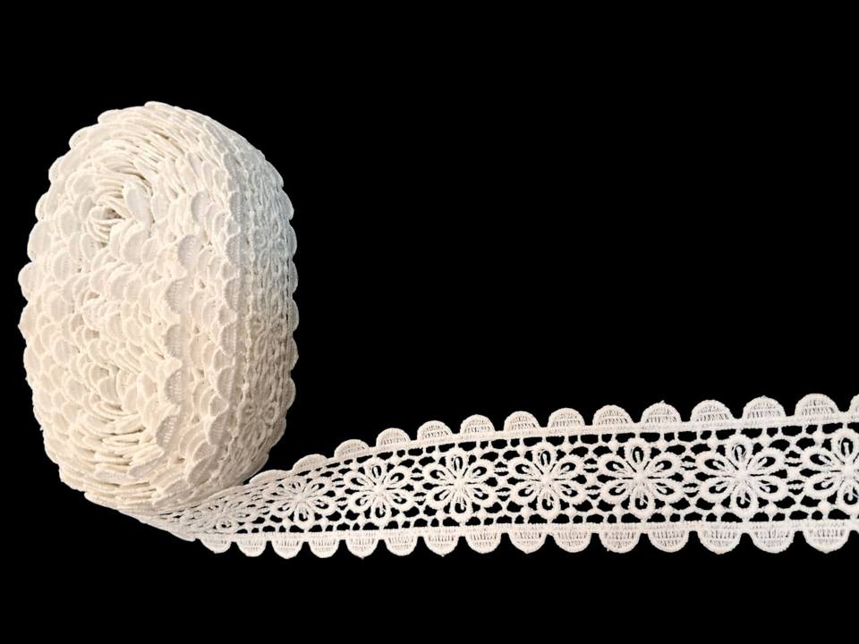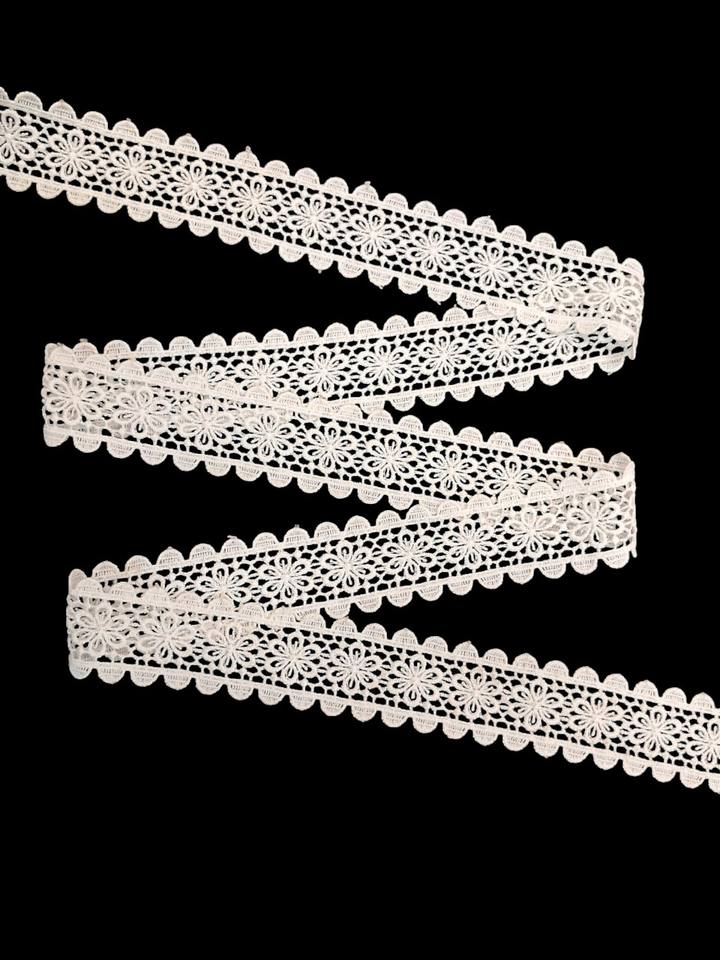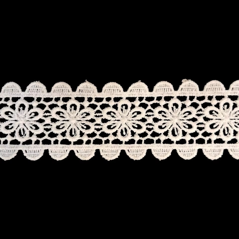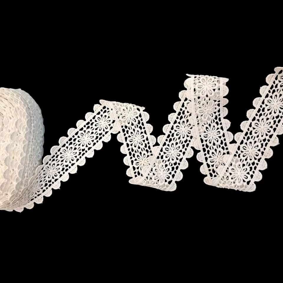 ลูกไม้กีปัวร์ลายดอกไม้สีขาวโพลีเอสเตอร์จากโรงงานโดยตรง – ริบบิ้นโครเชต์ลายดอกเดซี่ขอบหยักสองชั้นสำหรับเสื้อผ้าและของตกแต่งบ้าน