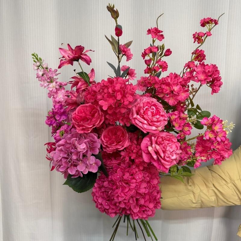 ดอกไม้ประดิษฐ์สีแดงชมพูขายส่งจากโรงงานโดยตรง ช่อดอกกุหลาบไฮเดรนเยียผสมสำหรับตกแต่งโต๊ะงานแต่งงาน