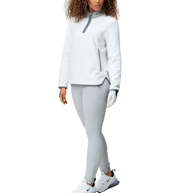 โรงงานโดยตรงผู้หญิง100% โพลีเอสเตอร์สีขาวประสิทธิภาพขนแกะครึ่งคอซิปเสื้อกันหนาวหมวก