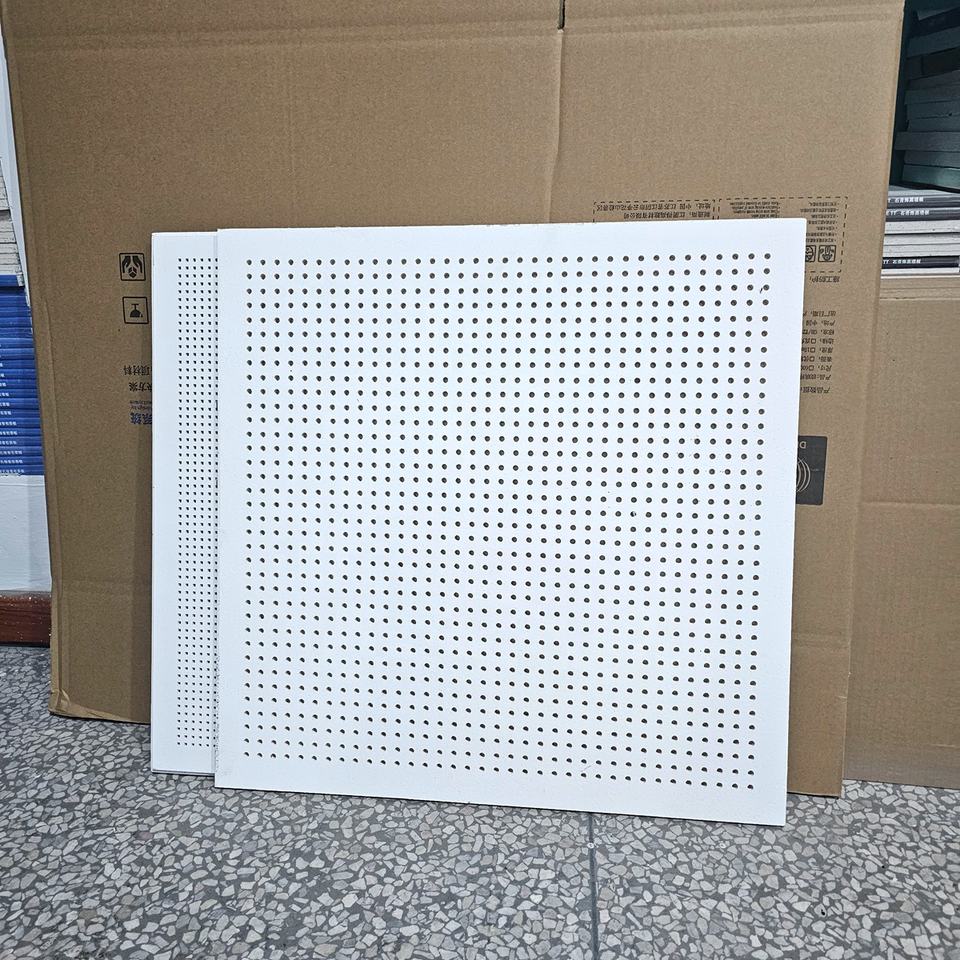 แผ่นฝ้าเพดานยิปซัมสำเร็จรูป ขนาด 600x600 มม. แบบเจาะรูวงกลม แผ่นอะคูสติกกันไฟระดับ A2 ลดเสียงสะท้อน NRC0.8