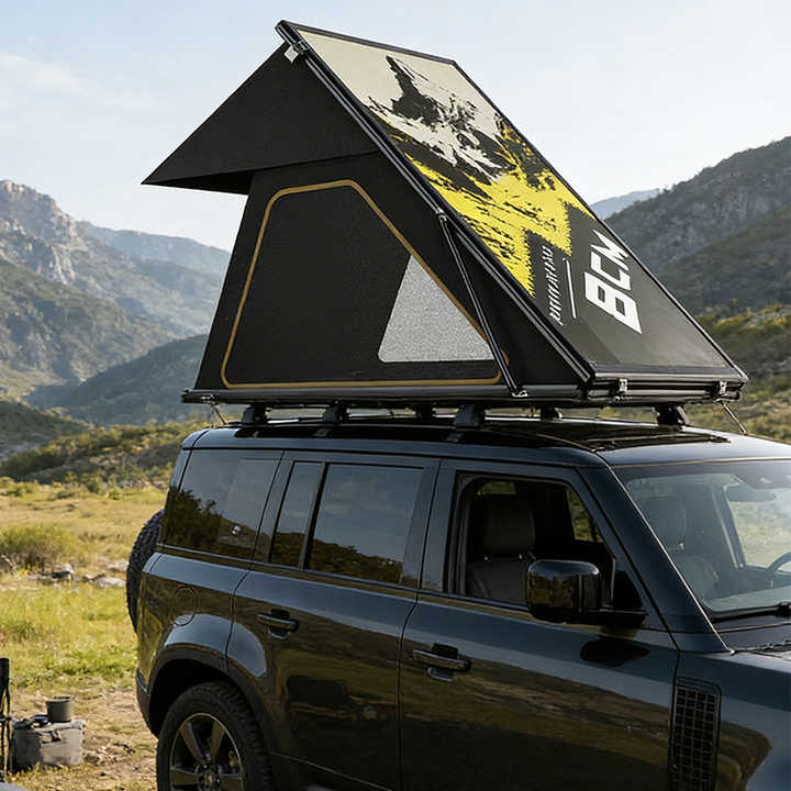 เต็นท์หลังคาทรงสามเหลี่ยมแบบแข็งทำจากอะลูมิเนียมสำหรับรถยนต์ พร้อมเสาคาร์บอนไฟเบอร์ สำหรับติดตั้งบนแร็คหลังคาและแผงโซลาร์เซลล์