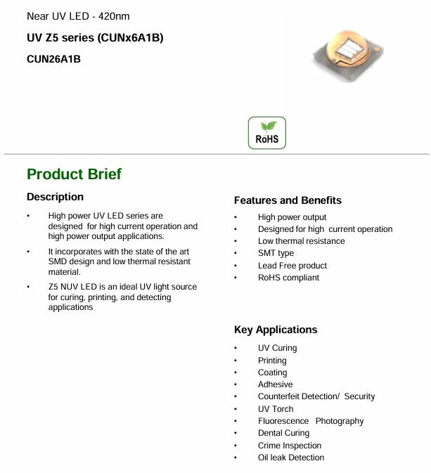 ชิป LED UV สำหรับเคลือบ395 NM Seoul viosis 3.6V 3.5mm x 3.5mm