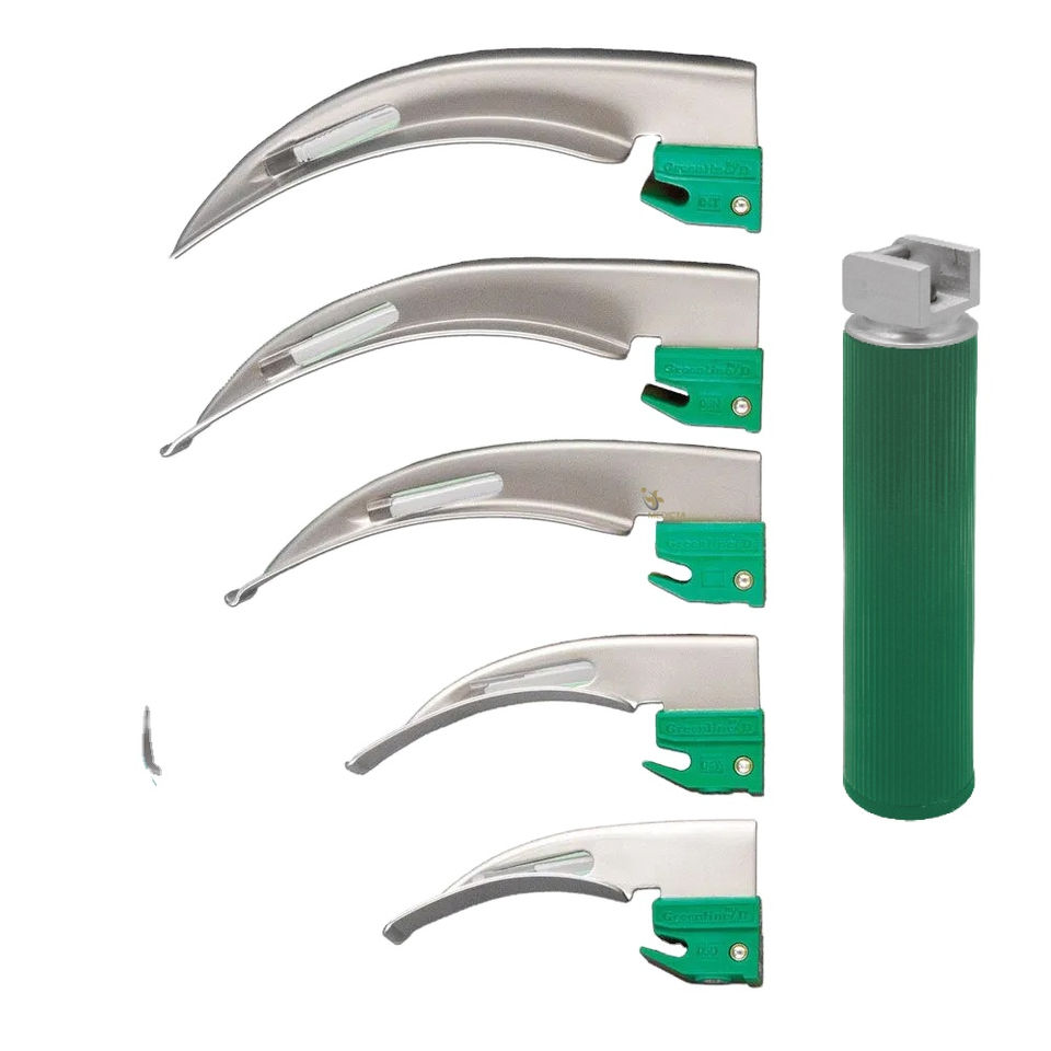 ชุดเครื่องมือตรวจวินิจฉัยทางศัลยกรรมแบบแมนนวล ไฟเบอร์ออปติก พร้อมใบมีด 4 แบบ ผลิตจากโรงงาน ทำจากสแตนเลส ยี่ห้อ Macintosh