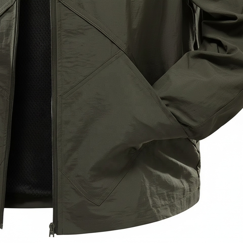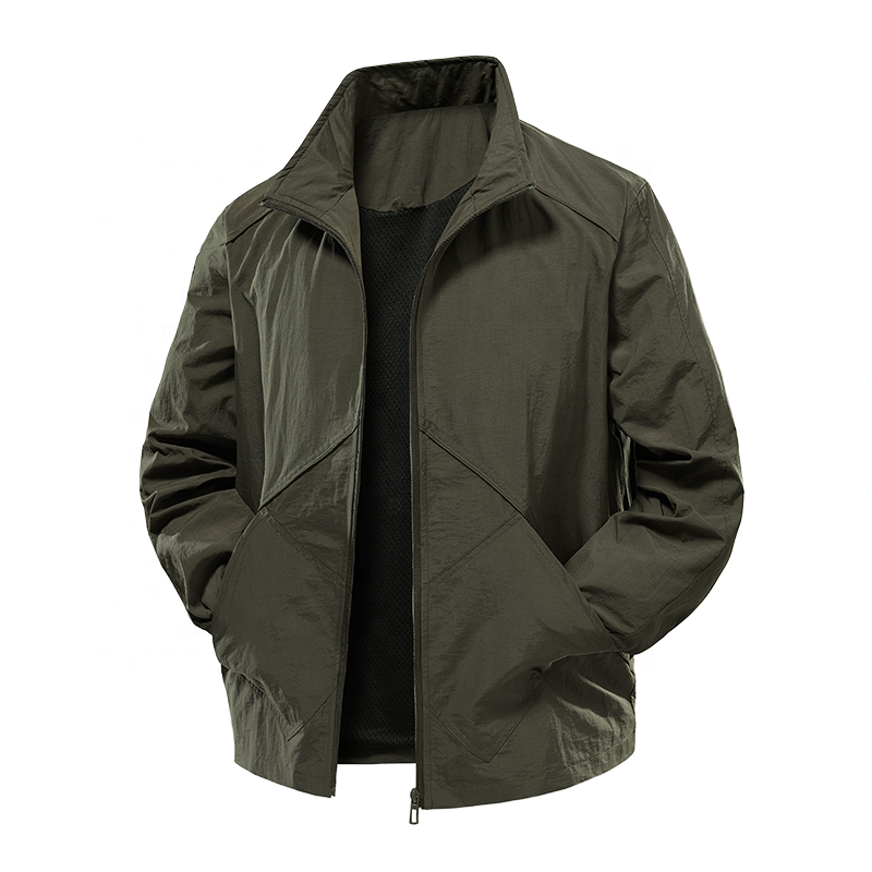 เสื้อแจ็คเก็ตวินด์เบรกเกอร์สำหรับคนทำงาน ดีไซน์ฮิปฮอป แฟชั่นสปอร์ต สไตล์ซาฟารี คอตั้งแบบซิป ผลิตจากโรงงาน รับบริการ OEM