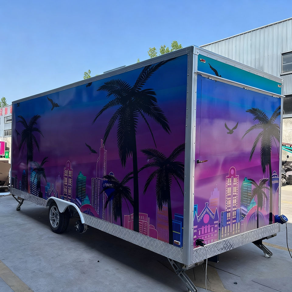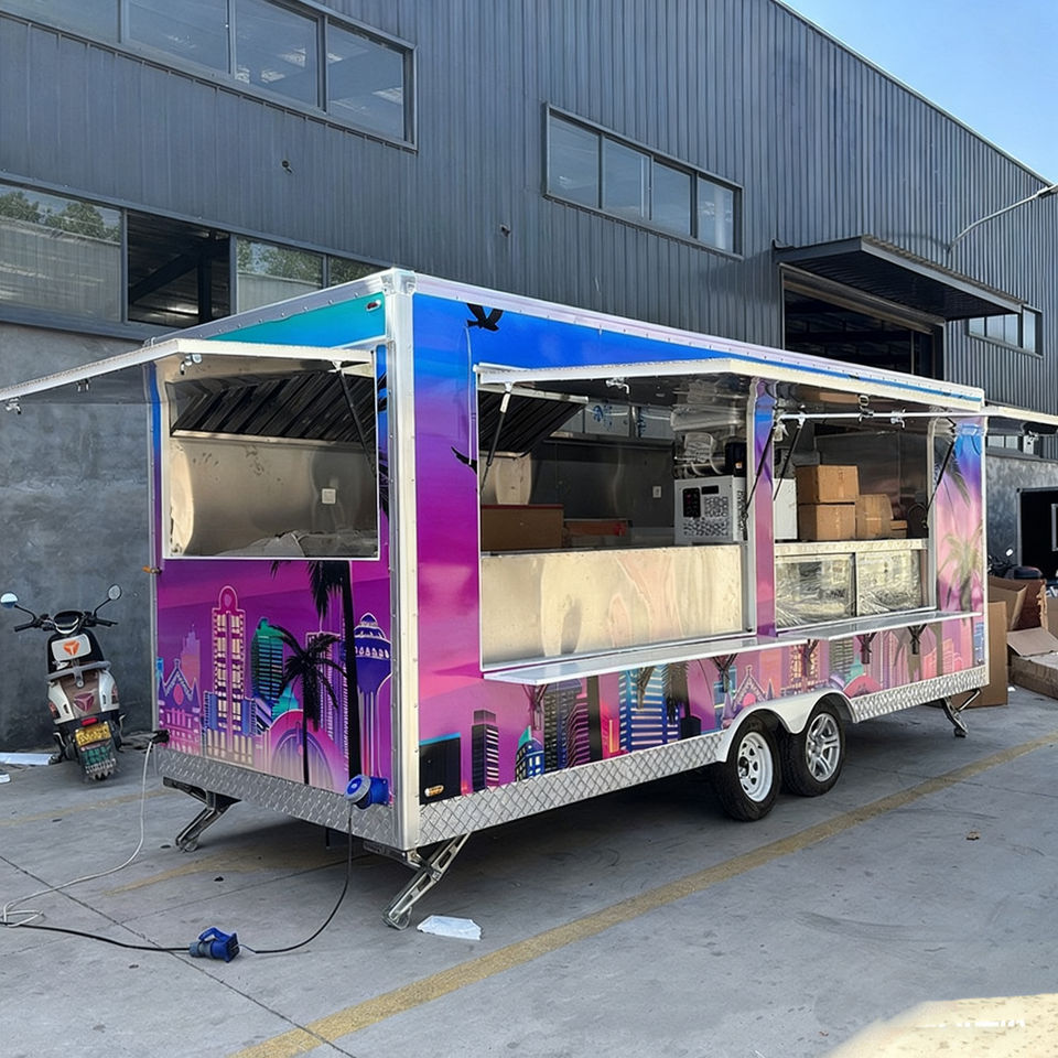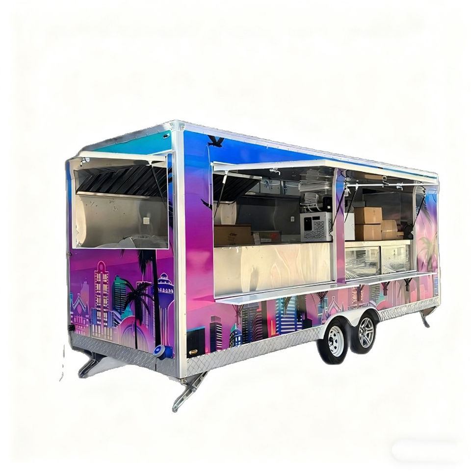 รถพ่วงสเตนเลสสตีลทรงสี่เหลี่ยมอเนกประสงค์สำหรับขายอาหารช่องเก็บอุปกรณ์เคลื่อนที่สำหรับอาหารจานด่วน