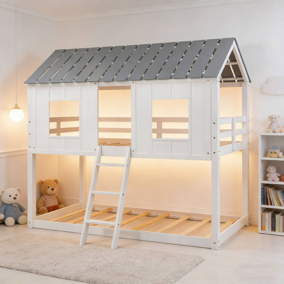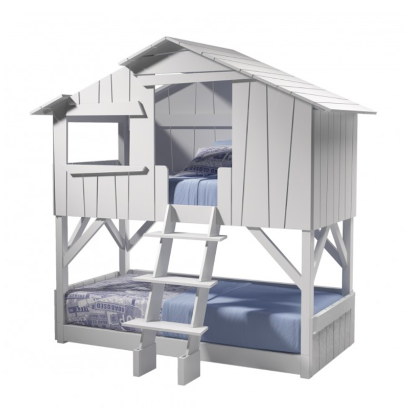 เตียงสองชั้นทรงบ้านต้นไม้สีขาวสำหรับห้องนอนเด็ก ผลิตจากโรงงาน เตียงไม้ทรงบ้านต้นไม้สำหรับเด็ก