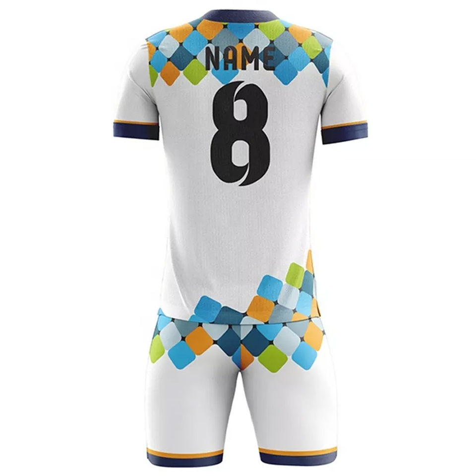 ชุดฟุตบอลยูนิเซ็กซ์ผลิตจากโรงงาน ผ้าโพลีเอสเตอร์ 100% แบบซับลิเมชั่น พร้อมกางเกงขาสั้น รับผลิตแบบ OEM/ODM ไซส์ใหญ่ ระบายเหงื่อ ป้องกันแบคทีเรีย