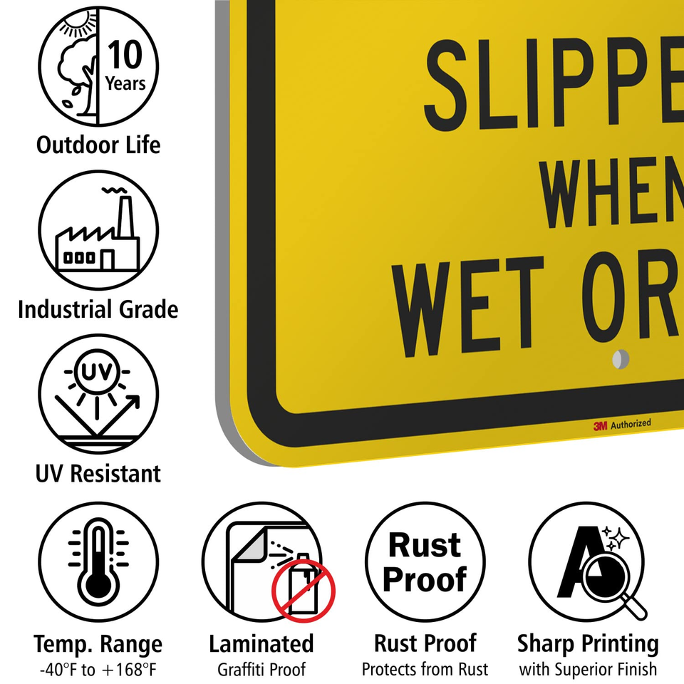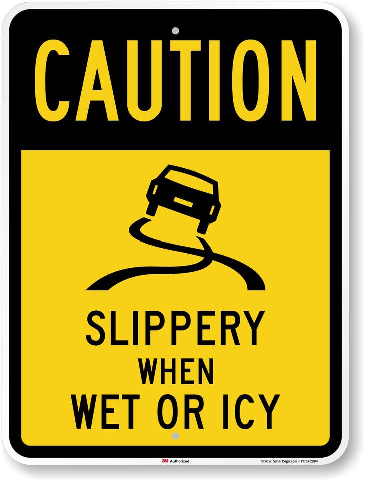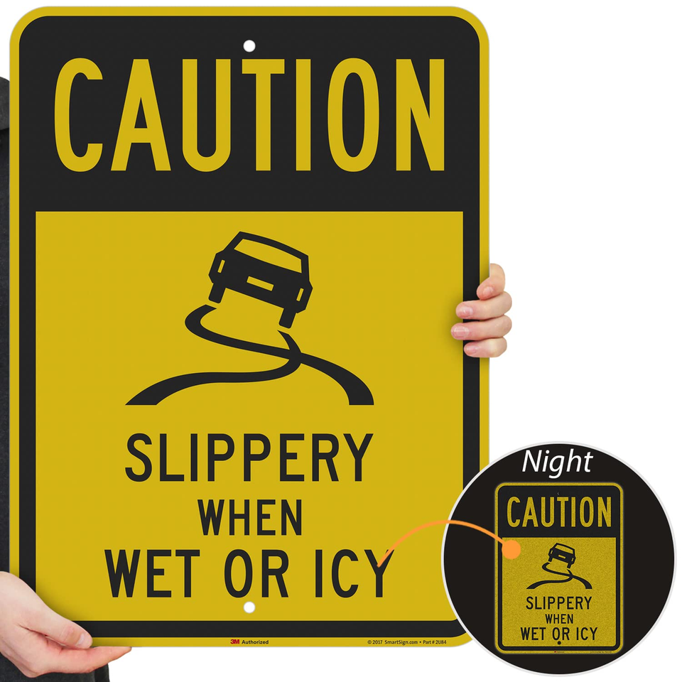 ป้ายโลหะเตือนระวังพื้นลื่นเมื่อเปียกหรือมีน้ำแข็ง ผลิตจากโรงงาน ป้ายจราจร ราคาโรงงาน ป้ายถนนอะลูมิเนียมทนทาน