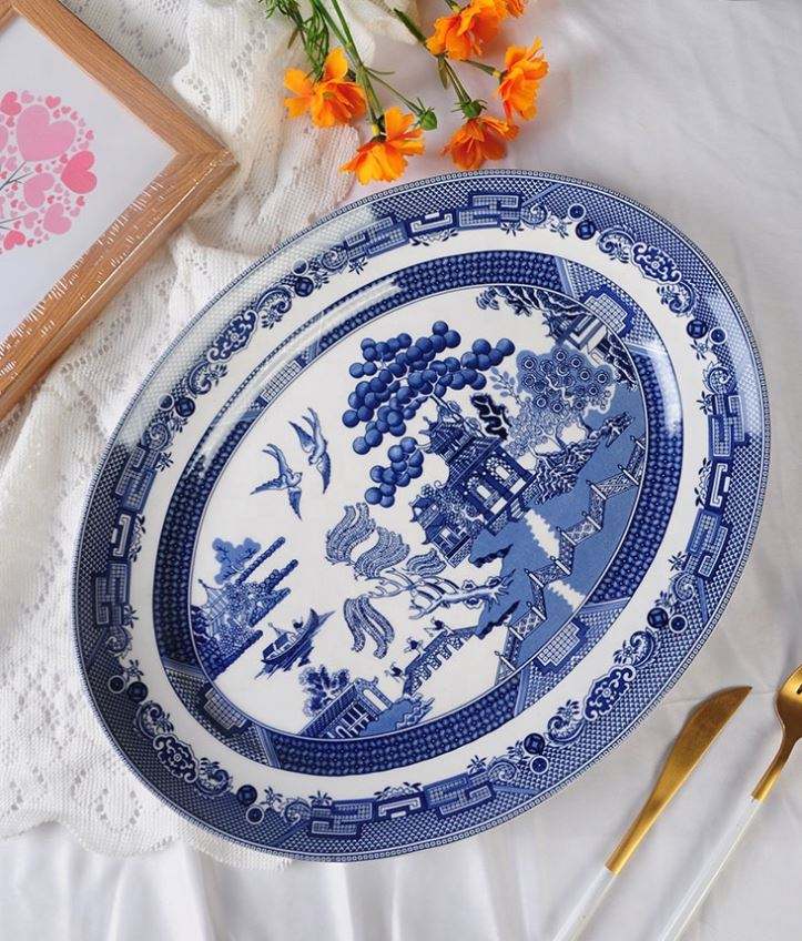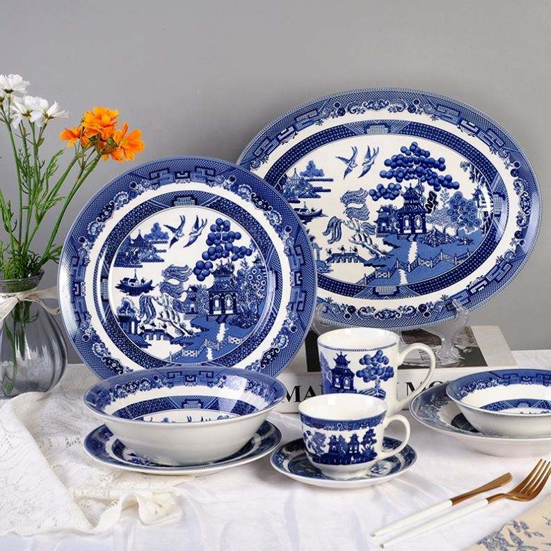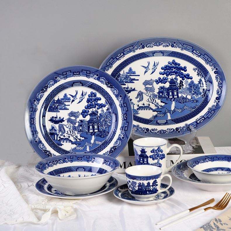 ชุดอาหารค่ำพอร์ซเลนสีน้ำเงินคลาสสิกคุณภาพสูงจากโรงงานผู้ผลิต จานสเต็กและจานซุปราคาประหยัดสำหรับใช้บนโต๊ะอาหาร