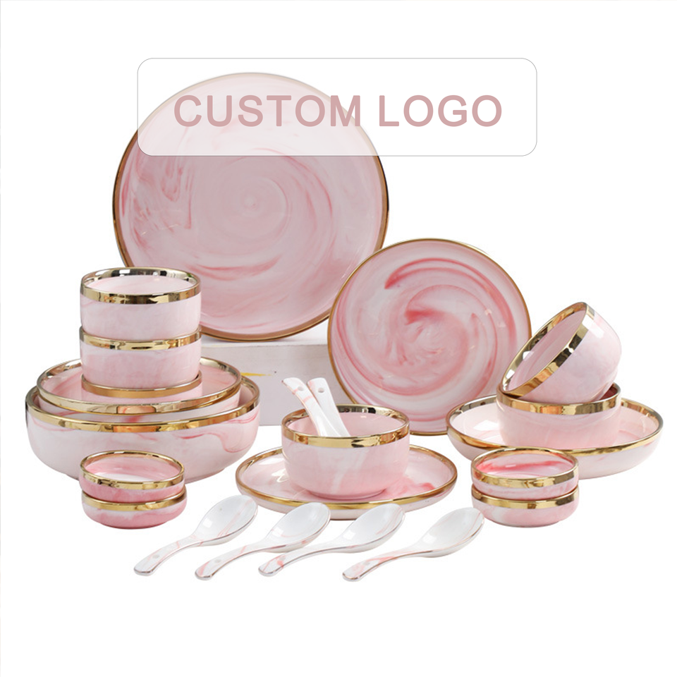 ชุดจานลายหินอ่อนสีชมพูทองสไตล์นอร์ดิกชุดจานชามบนโต๊ะอาหารเซรามิกลายครามจีน