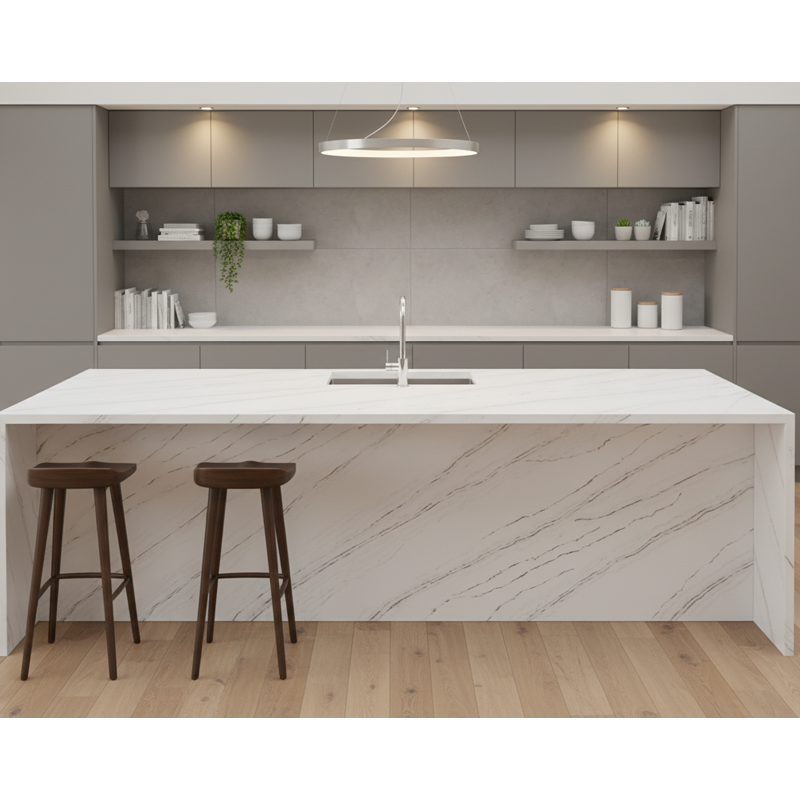 Calacatta แผ่นหินตกแต่งสำหรับห้องครัวเกาะห้องน้ำโต๊ะเครื่องแป้งด้านบนผลิตจากหินอ่อนหลอดเลือดดำสีเทาสีขาว