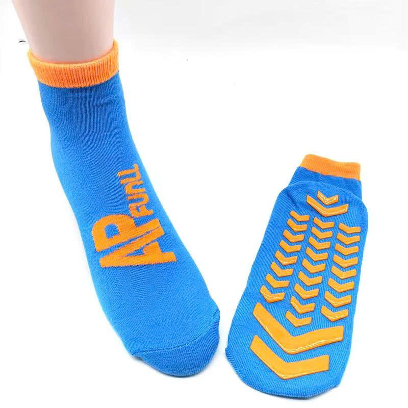 ถุงเท้ากันลื่นสำหรับเด็กเล่นในร่ม พิมพ์โลโก้ตามสั่งสำหรับโรงงาน ผลิตจากซิลิโคน ป้องกันการลื่นไถล เหมาะสำหรับสนามเด็กเล่นในร่มและแทรมโพลีน