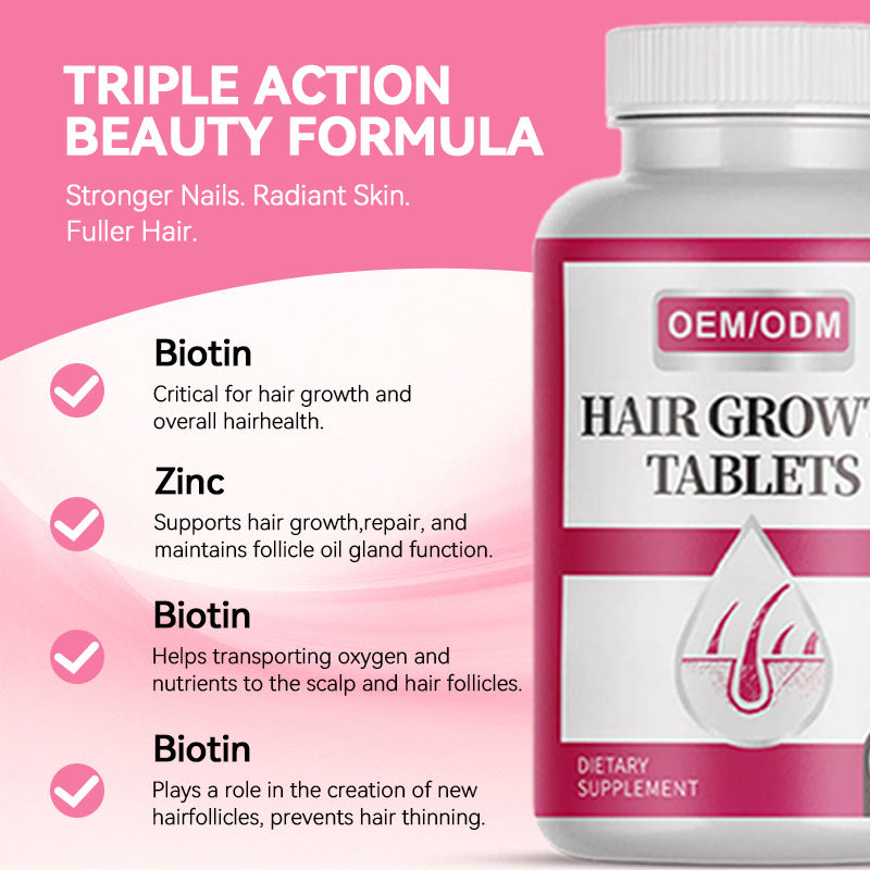 ยาเม็ดเร่งผมยาวสูตรโรงงาน OEM สำหรับมืออาชีพ ผสมไบโอตินและเคราติน เพื่อผมหนาขึ้น สุขภาพดีขึ้น และบำรุงหนังศีรษะ