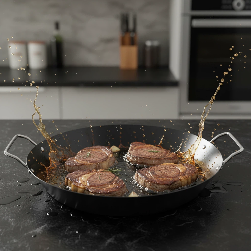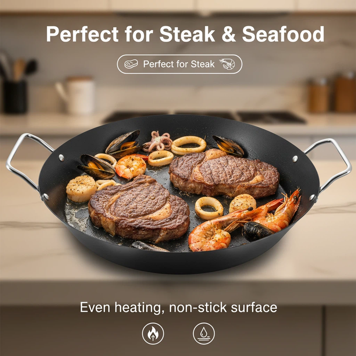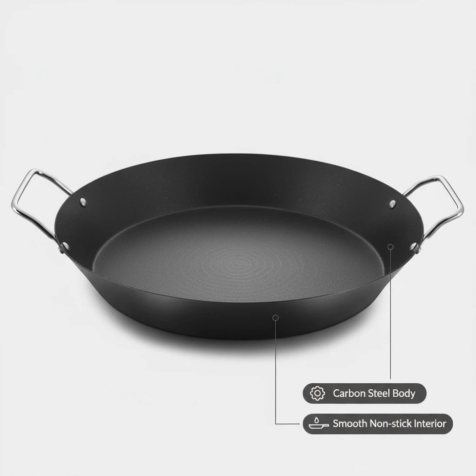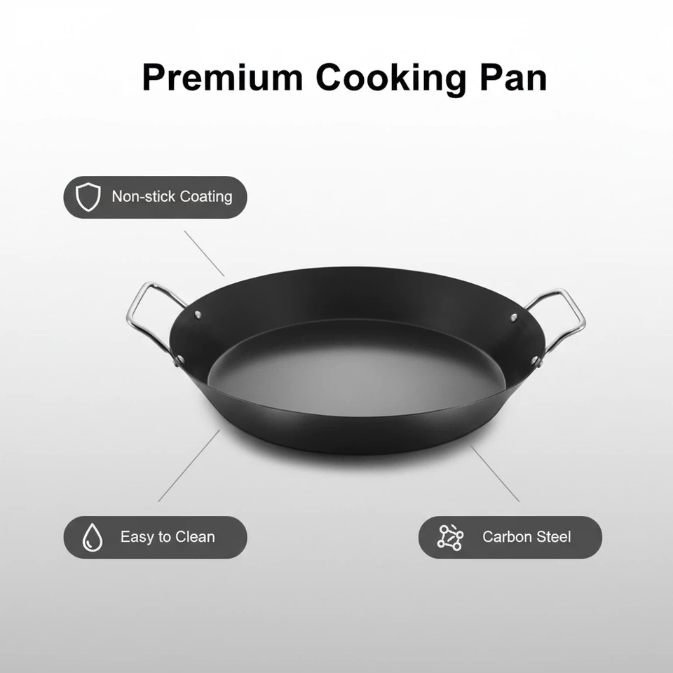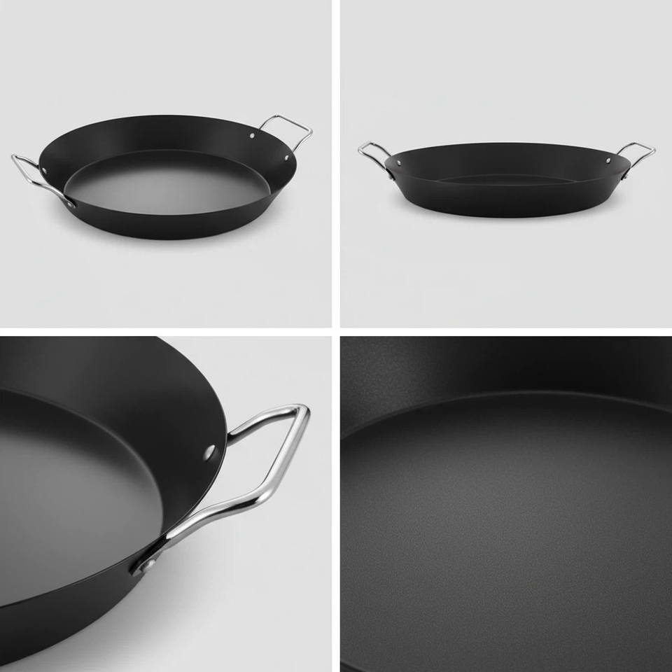 กระทะปาเอญ่า ผลิตจากโรงงาน แบบ OEM อเนกประสงค์ หนา 1.5 มม. ทำจากเหล็กกล้าคาร์บอนเคลือบสารกันติด ขนาด 22 ซม. 26 ซม. 30 ซม. 34 ซม. 38 ซม. 42 ซม. มีหูจับสองข้าง