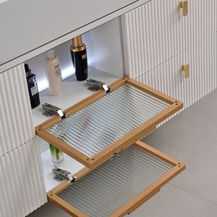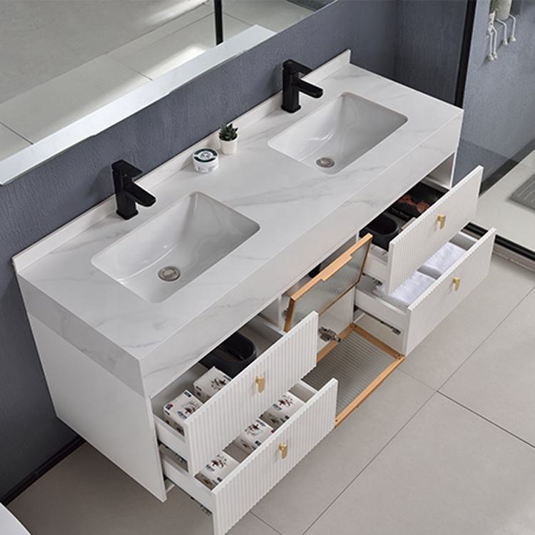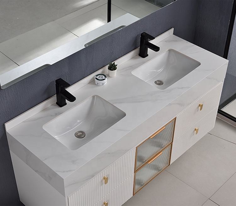 ชื่อผลิตภัณฑ์:โต๊ะเครื่องแป้งในห้องน้ำแบบแขวนผนังสีขาวมีอ่างล้างหน้าคู่ต่ำ