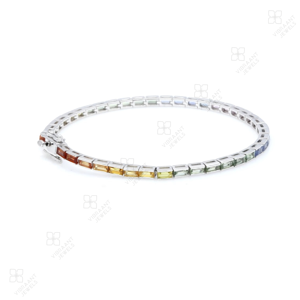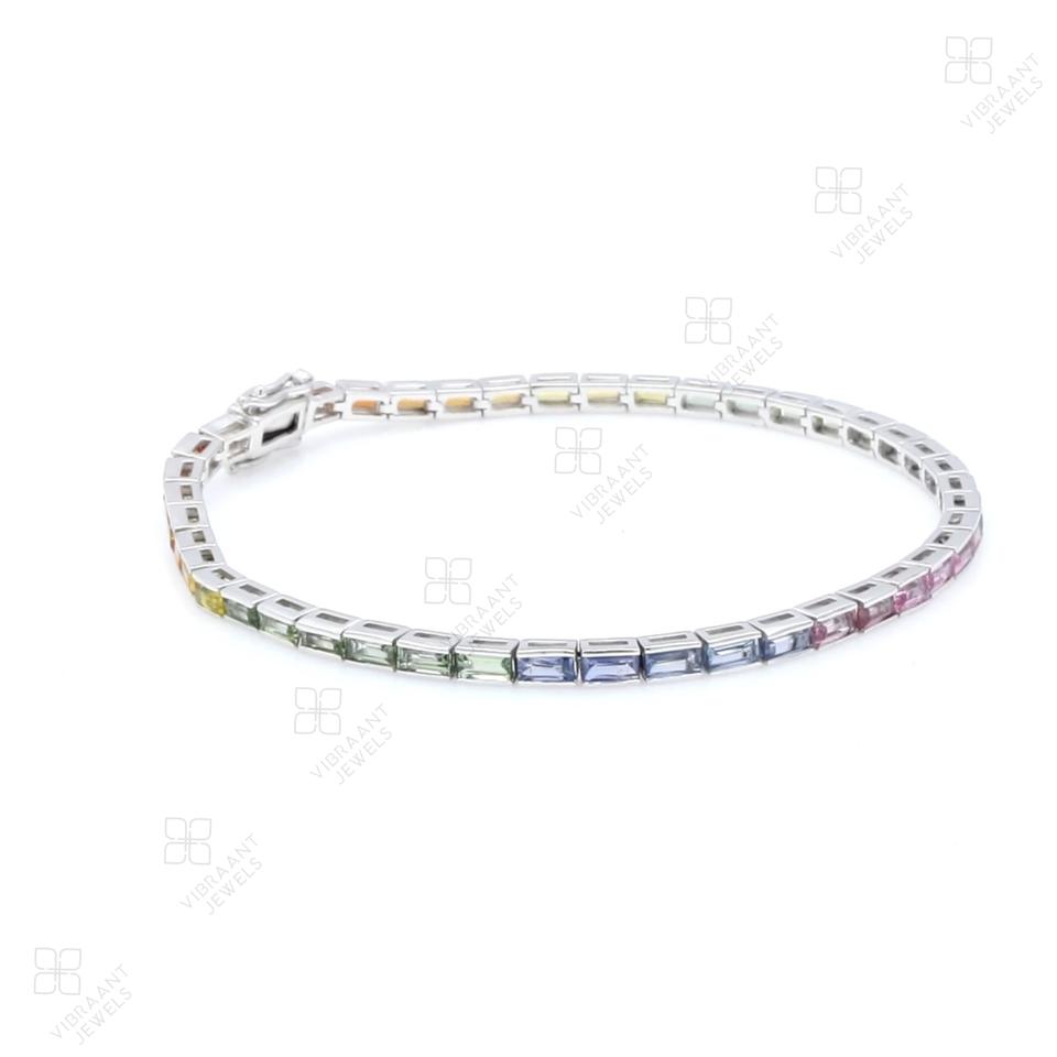 สร้อยข้อมือสีขาว14K ทำจากหินแซฟไฟร์หลายสีตัดเป็นช่องแบบบาแกตสร้อยข้อมือสีรุ้งประดับแซฟไฟร์