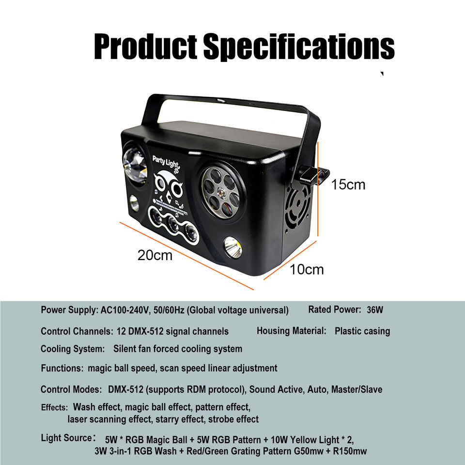 แหล่งกำเนิดแสง1:5W * ลูกบอลวิเศษ RGB + 5W ลวดลาย RGB + 10W แสงสีเหลือง * 2