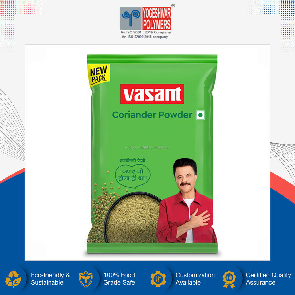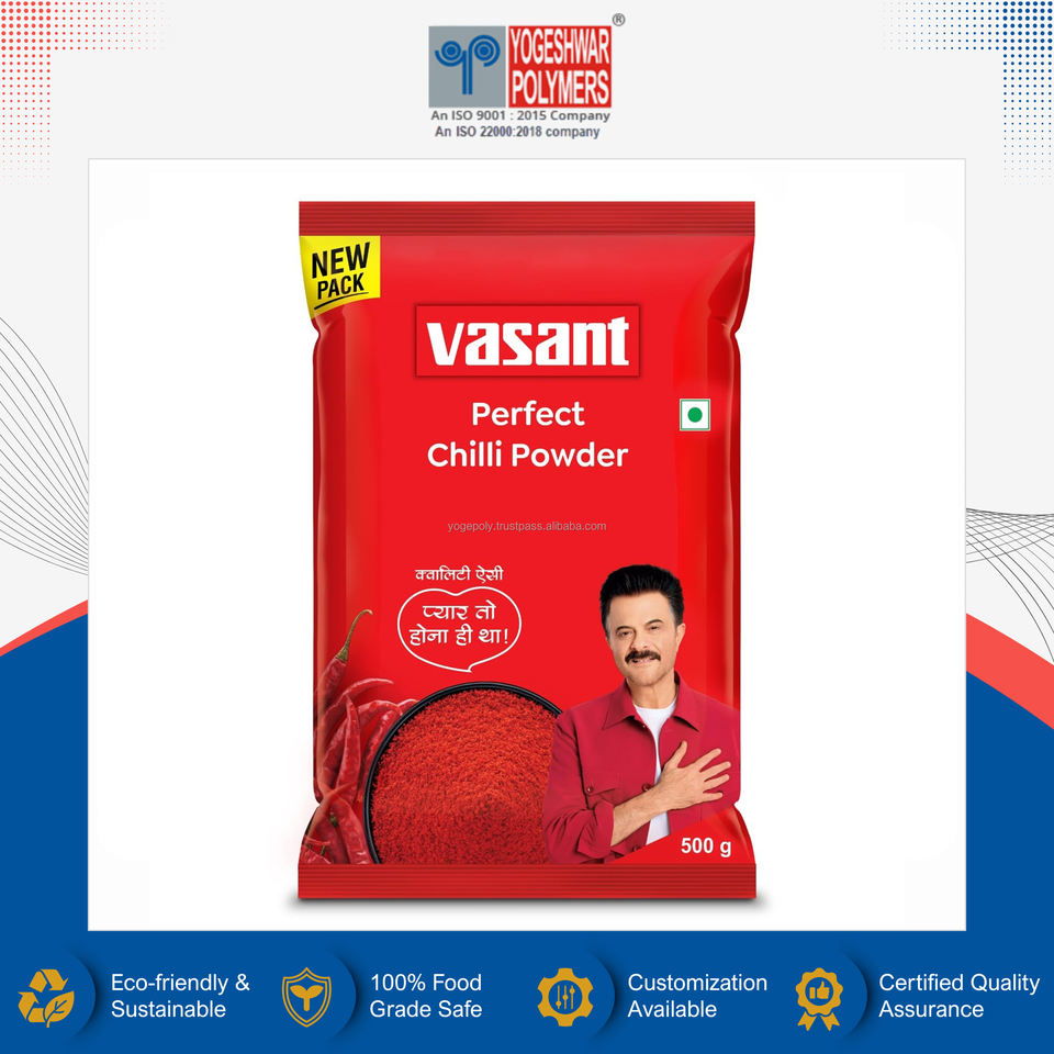 ราคาโรงงาน ขายดีที่สุด บรรจุภัณฑ์เครื่องเทศแบบซีลกลาง พิมพ์ลายหลากสี คุณภาพสำหรับอาหาร ปรับแต่งได้ ยี่ห้อ YOGESHWAR POLYMERS รุ่น YP79