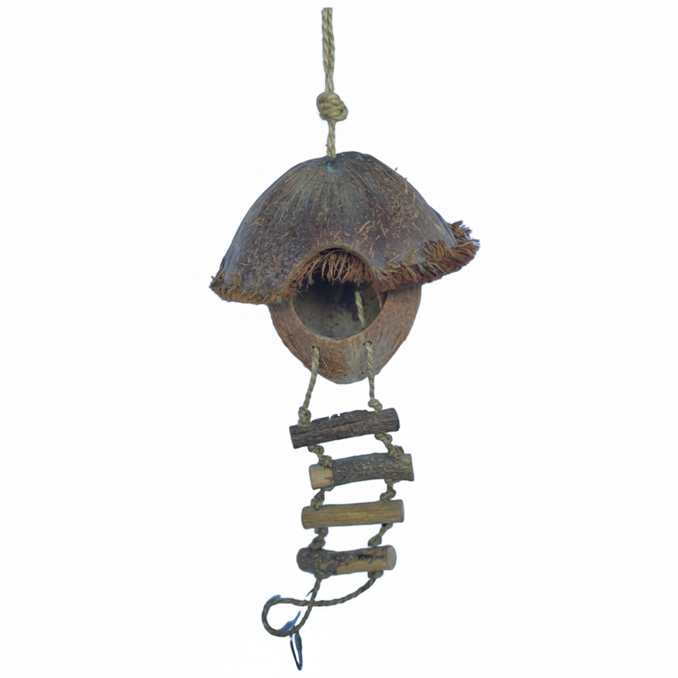 Factory Price Coconut Shell Bird Nest with Wooden Ladder | Eco Parrot Nesting Toy for Lovebirds, Finches, Budgies