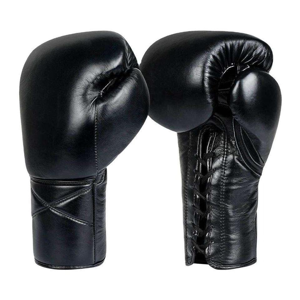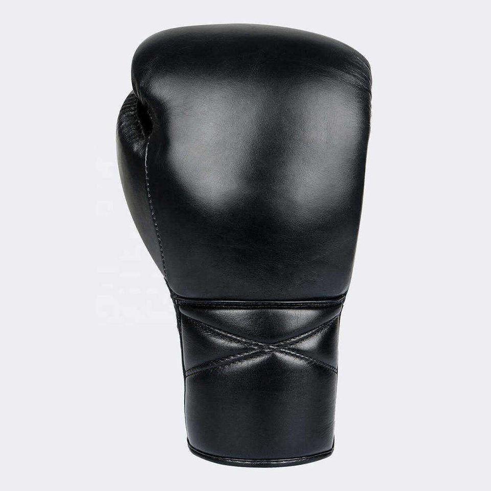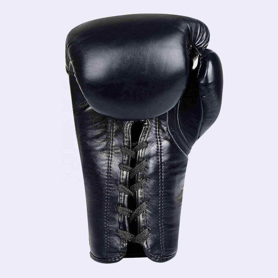 ถุงมือคิกบ็อกซิ่งหนังสีดำมีคุณสมบัติผูกเชือกถุงมือแข่งขันแบบยืดได้