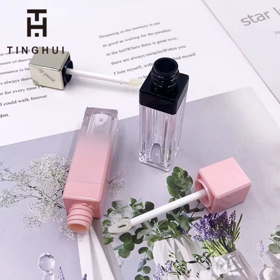 ราคาโรงงาน หลอดลิปกลอสเปล่าแบบกำหนดเอง ทรงสี่เหลี่ยมไล่สีชมพู สวยหรู พร้อมแปรง วัสดุพลาสติก ขั้นต่ำ 100 ชิ้น