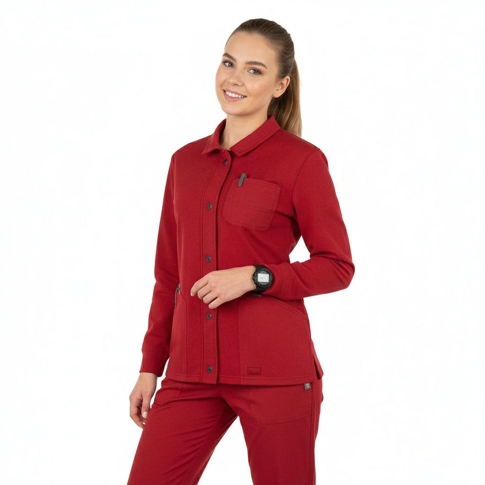 เสื้อสครับแพทย์แบบสั่งทำราคาโรงงาน กระดุมแป๊ก ติดกระดุมหน้า เสื้อคลุมอุ่นๆ ชุดพยาบาล แขนยาว มีกระเป๋า ขายส่งจำนวนมาก