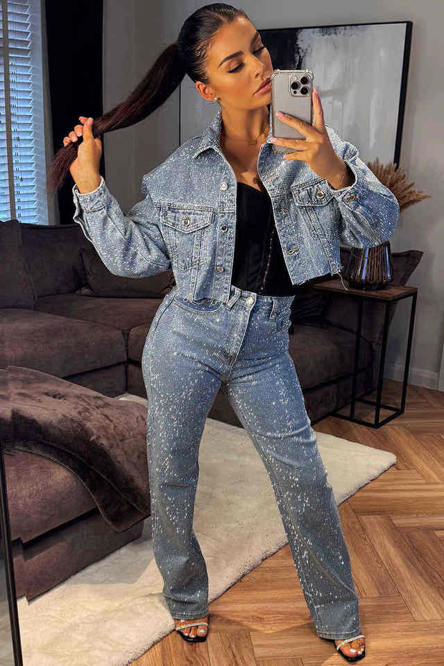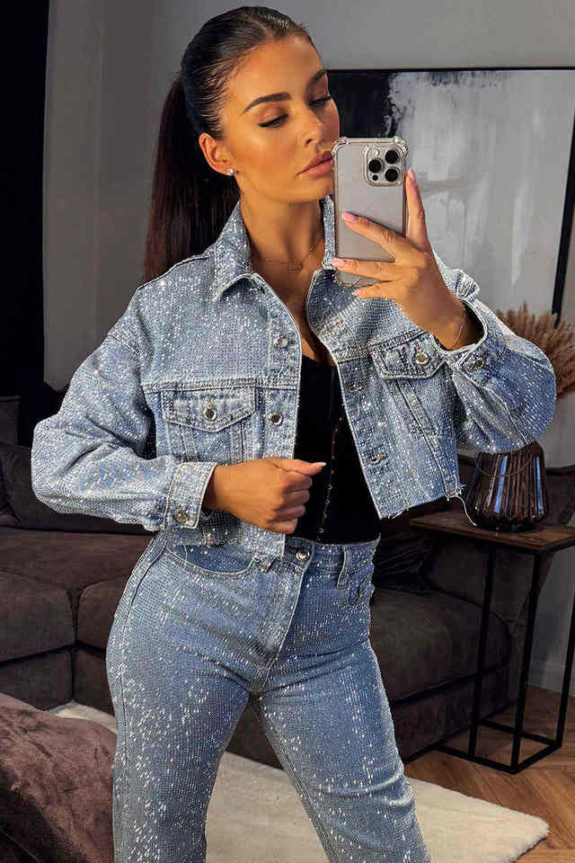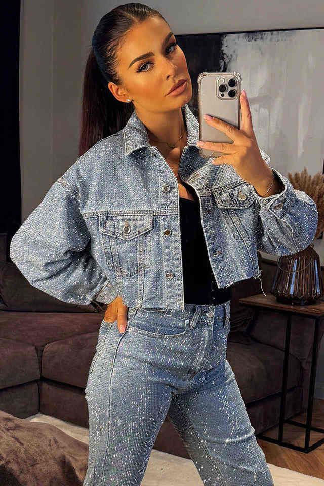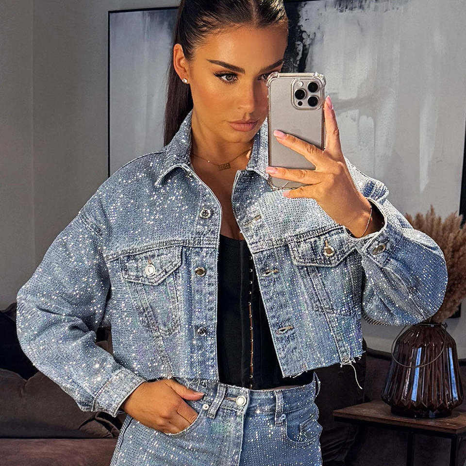 แจ็คเก็ตยีนส์สีฟ้าอ่อนแบบครอป ประดับคริสตัล แขนยาว ออกแบบสำหรับผู้หญิง ราคาโรงงาน รับสั่งทำ