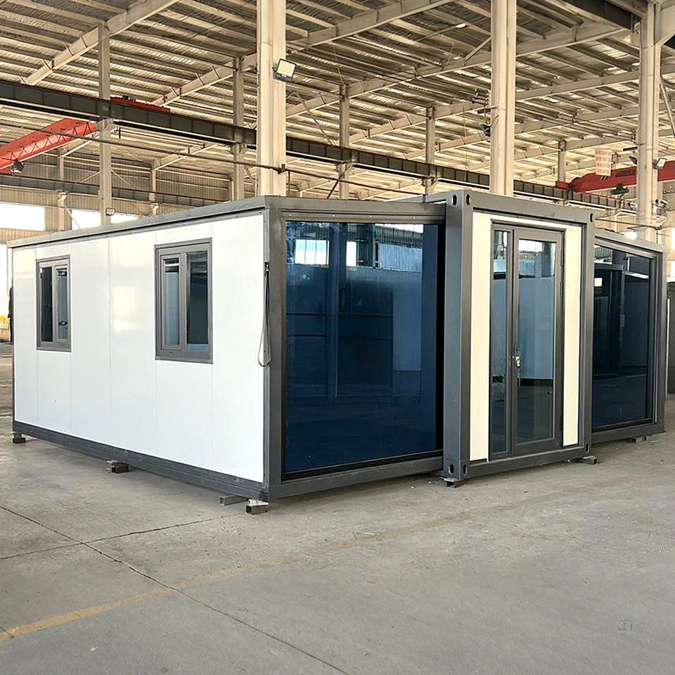 บ้านเหล็กขนาดเล็กแบบขยายได้สำหรับห้องนั่งเล่นกระจกเต็มรูปแบบ1ห้องนอน3ห้องห้องครัวบ้านสำนักงานห้องน้ำ