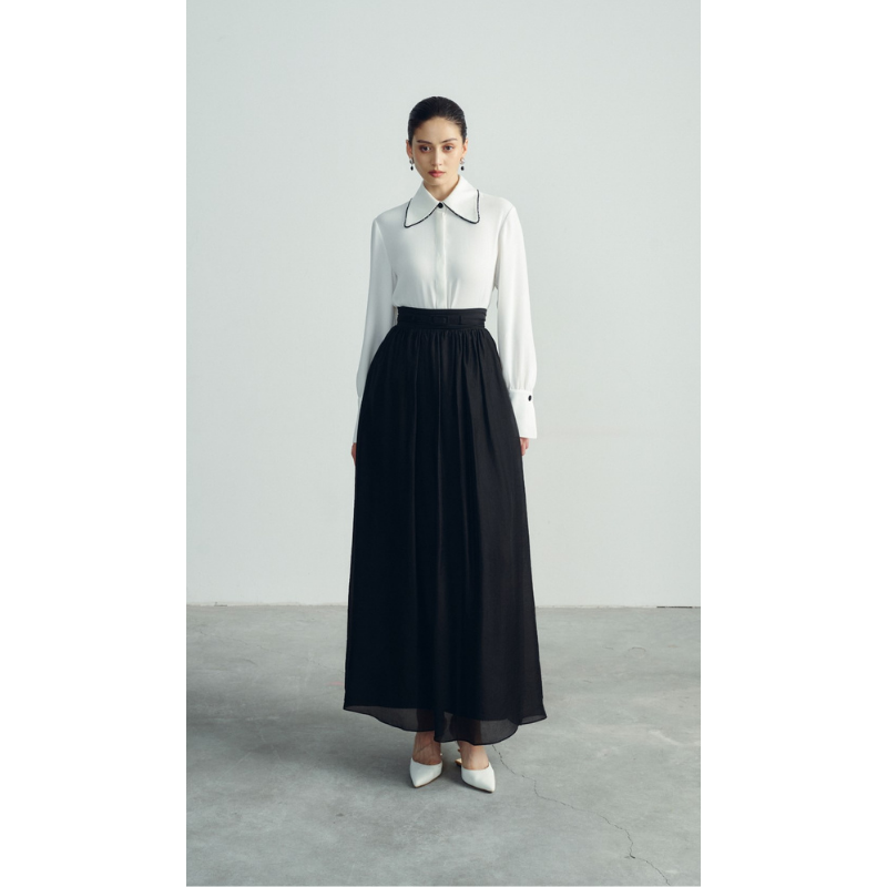 ราคาโรงงานกระโปรงยาวจีบผู้หญิงพร้อมเข็มขัดสีดําและสีน้ําตาลแจ็คแม็กซี่กระโปรงผ้าคูโพรคุณภาพสูงไวท์เทียนเวียดนาม