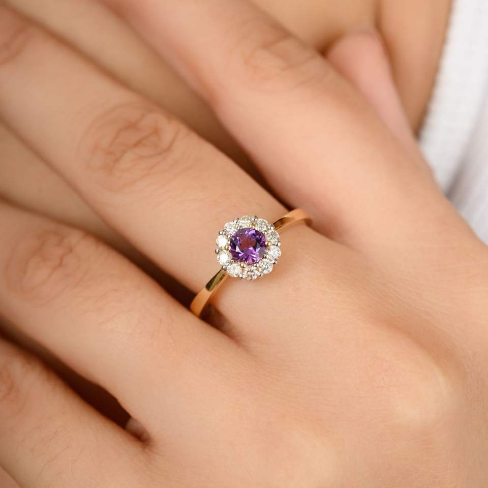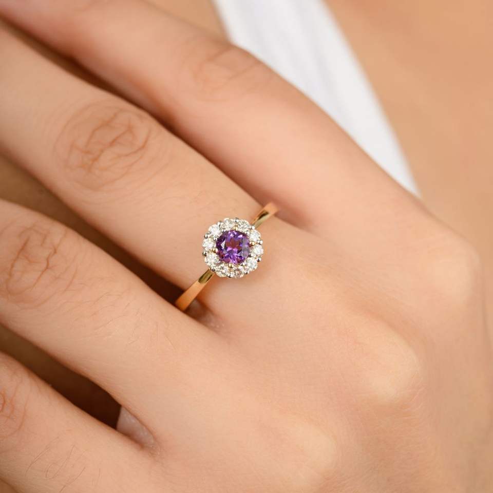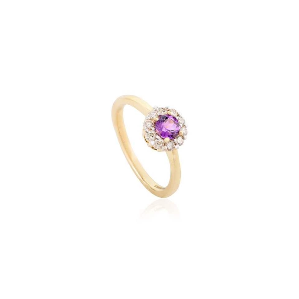 แหวนเพชรอเมทิสต์และฮาโลเจนเจียระไนแบบกลมดีไซน์หรูหราพร้อมของขวัญทองสีเหลือง14K สำหรับผู้หญิง