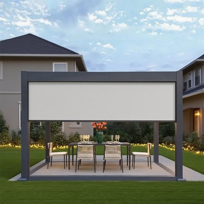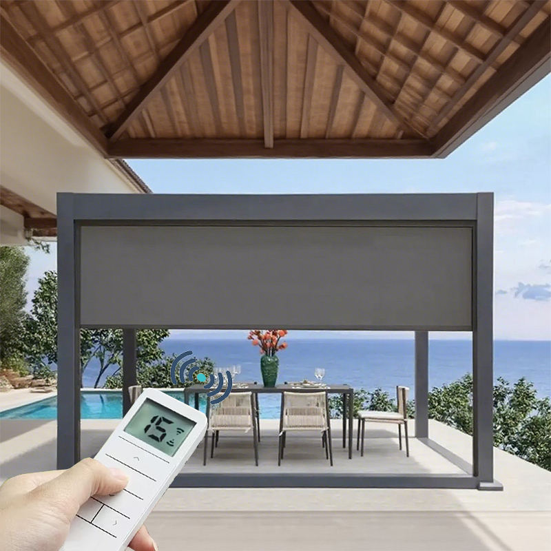 ม่านบังแดดกลางแจ้งกันน้ำใช้มอเตอร์ป้องกันฝนอัจฉริยะกันสาดการควบคุมระยะไกลทำจากโพลีเอสเตอร์ทนทานสำหรับ