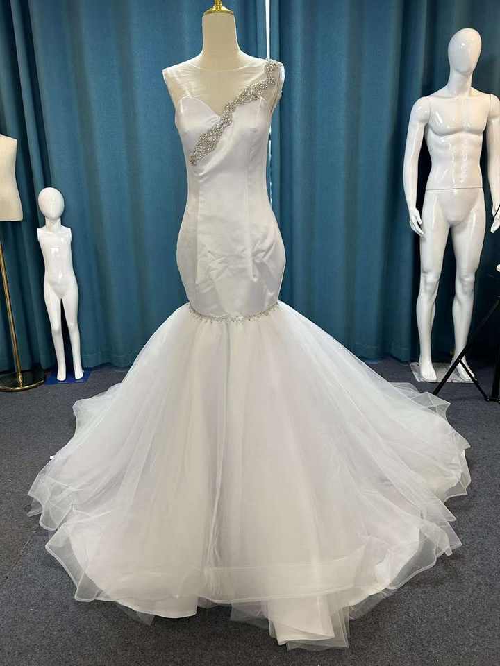 ชุดแต่งงานปักเลื่อมลูกปัดแบบเปิดไหล่สำหรับคนอ้วน