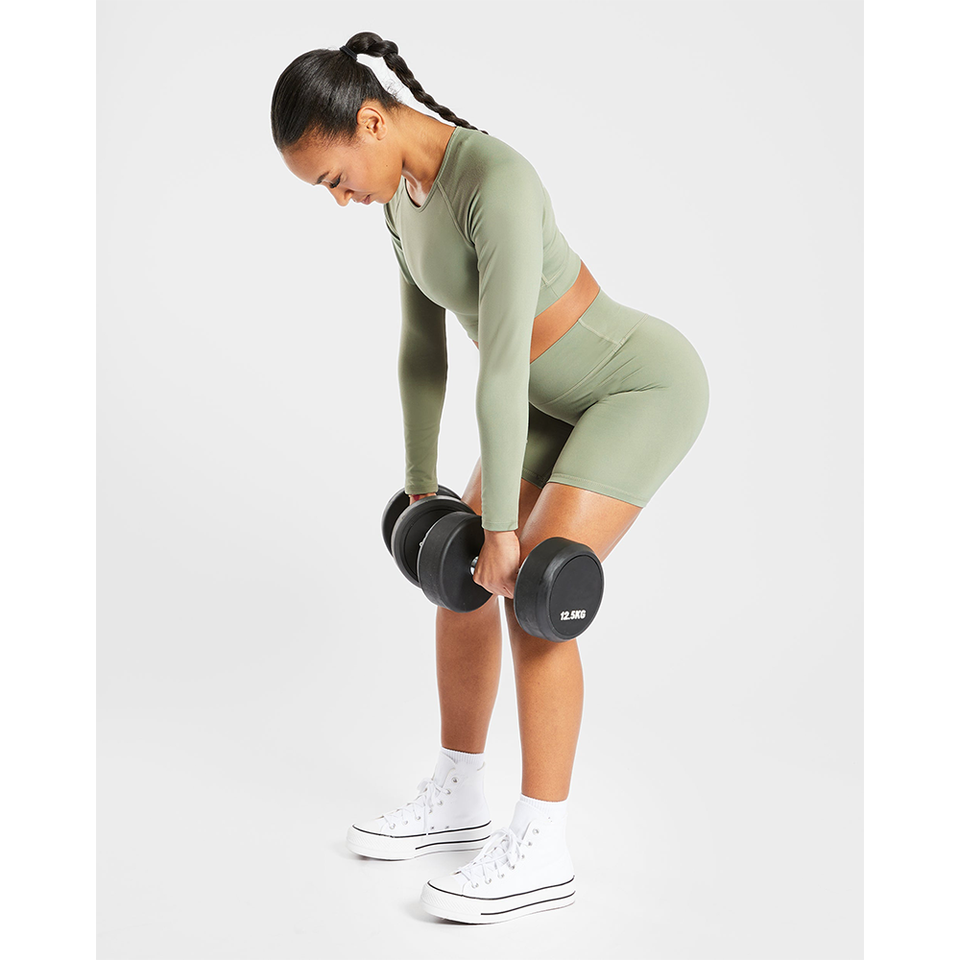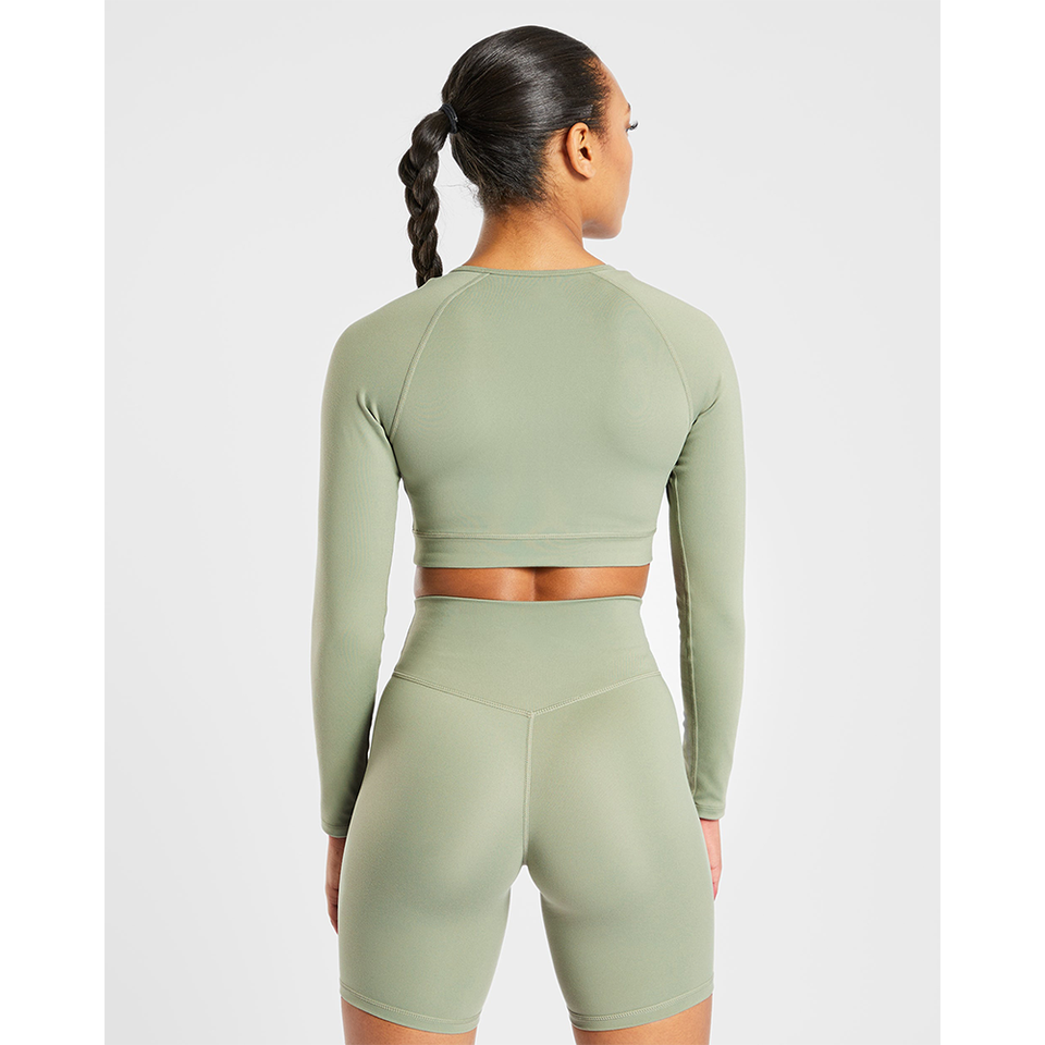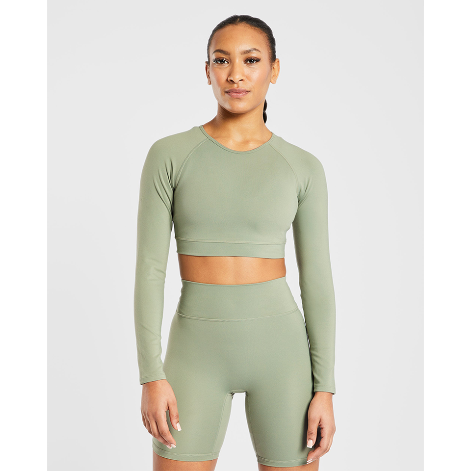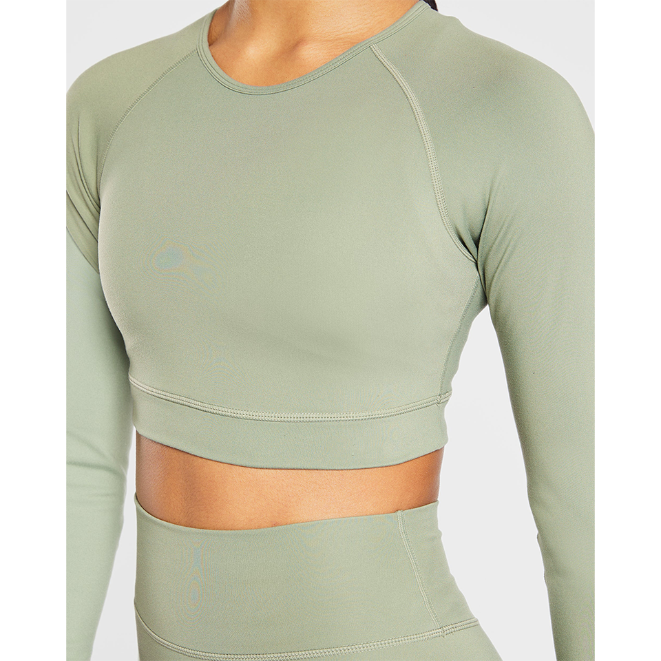 เสื้อครอปสำหรับผู้หญิงเสื้อครอปแขนยาวสีเขียวมะกอกเสื้อออกกำลังกายเนื้อนิ่มยืดได้4ทางและน้ำหนักเบา