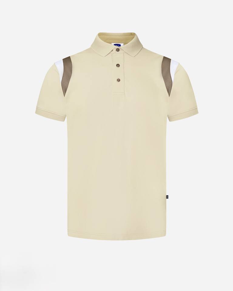 เสื้อโปโลลายทางสีตัดกันบนปกเสื้อถักและแขนเสื้อ