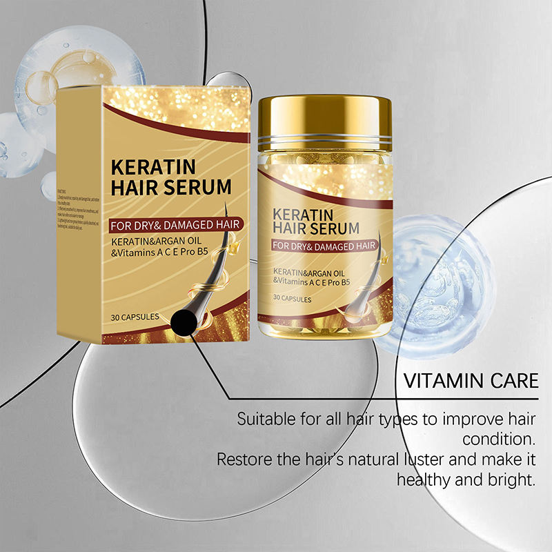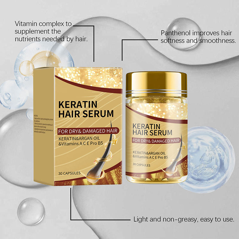 เซรั่มบำรุงเส้นผมแคปซูลเคราตินสูตรวิตามินบำรุงผมจากธรรมชาติ ปราศจากส่วนผสมจากสัตว์ ผลิตภายใต้แบรนด์ของคุณเอง ราคาโรงงาน
