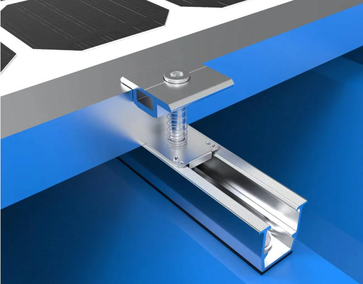 ตัวหนีบยึดแผงโซลาร์เซลล์รางขนาดเล็กแบบสี่เหลี่ยมคางหมูรางขนาดเล็กสำหรับติดหลังคาโลหะแบบหนีบ