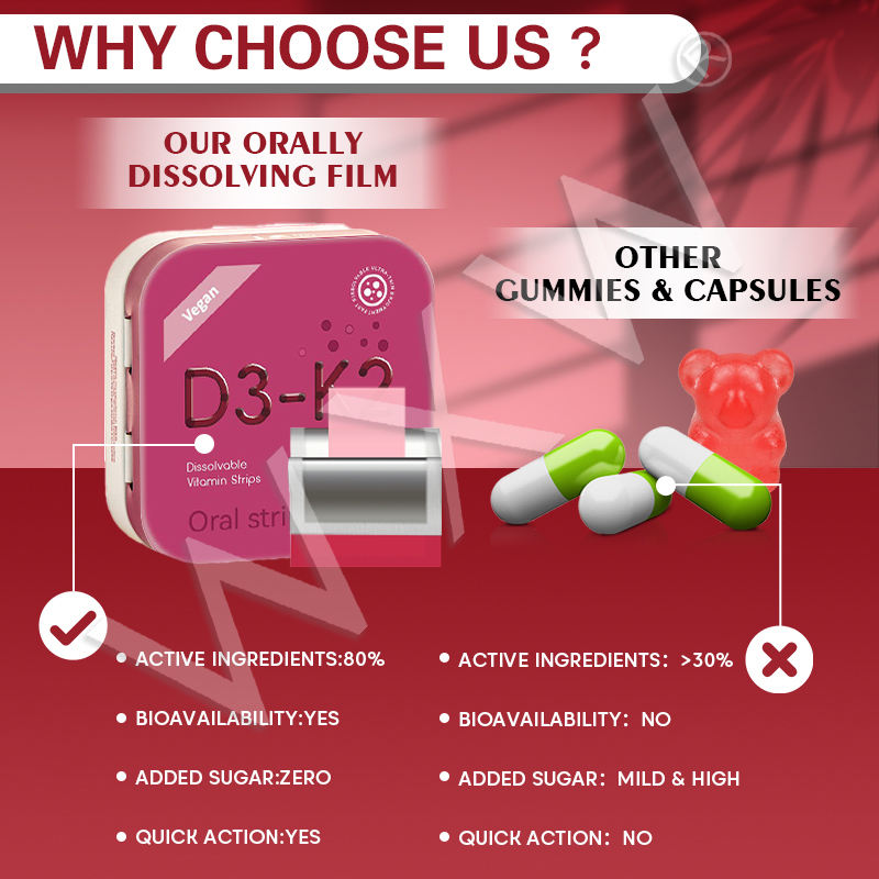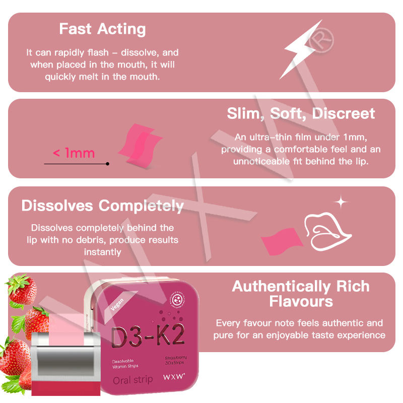 แผ่นฟิล์มบาง K2 D3วิตามินปราศจากน้ำตาลปรุงแต่งรสสตรอเบอร์รี่ K2ฟิล์มบำรุง D3ธรรมชาติ