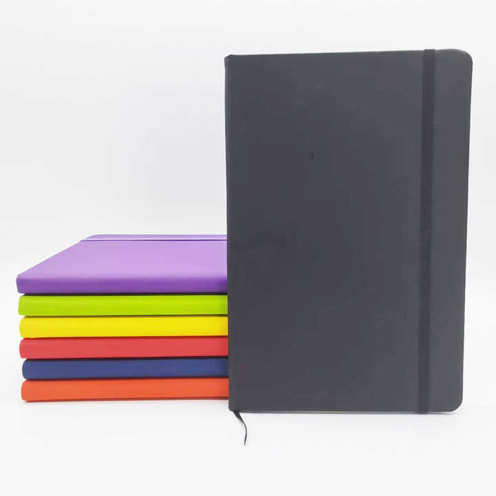 สมุดโน้ตปกแข็งหนัง PU แบบ OEM ODM ขนาด A5 พร้อมสายรัดยางยืด 80 แผ่น สีดำ เขียว แดง น้ำเงิน ชมพู เหลือง ส้ม