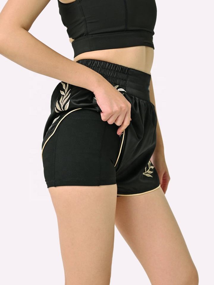 กางเกงมวยไทยผู้หญิงราคาโรงงานขายส่ง โลโก้ด้านหน้า น้ำหนักเบา ระบายอากาศได้ดี ผลิตจากโพลีเอสเตอร์ 100%