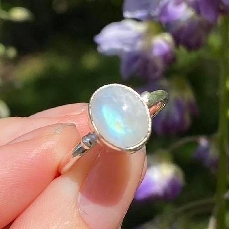 แหวนหมั้นพลอยมูนสโตนของผู้หญิงแหวนเครื่องประดับเงินสเตอร์ลิง925สไตล์โบฮีเมียนธรรมชาติมูนสโตน