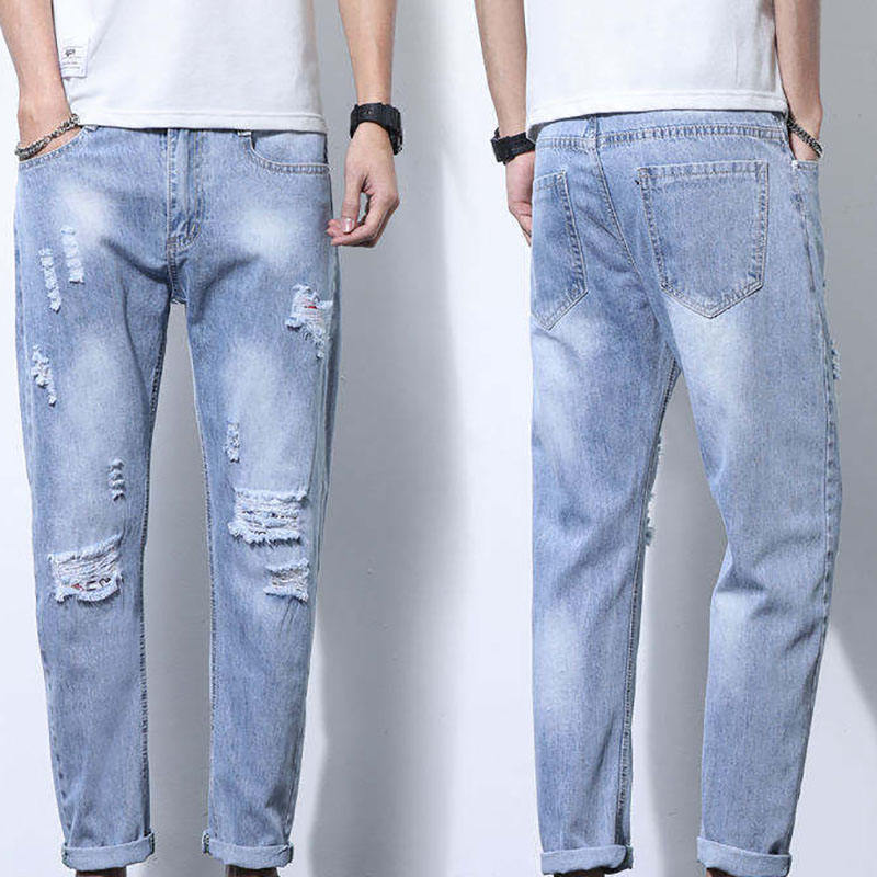 กางเกงยีนส์ขาหยาบแบบพอดีตัวสำหรับผู้ชายกางเกงยีนส์ทรงหลวมแนวสตรีทตามสั่ง